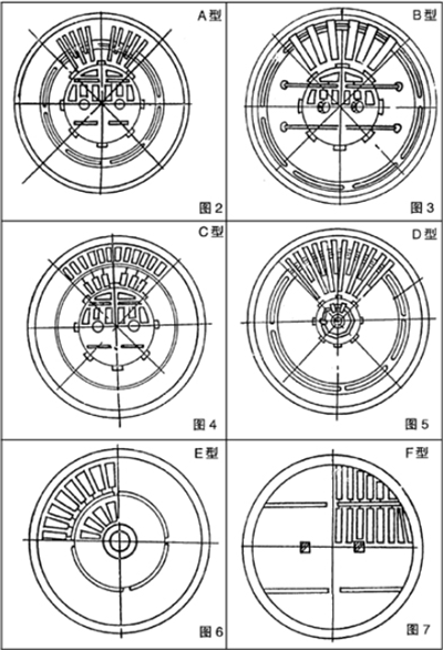 充氣箱在庫內排列時,原則上要求實際排列面積占總面積的比例越大越好,攪拌庫和混合式均化庫中心區(攪拌區),對這點要求更為重要,現提供A、B、C、D、E、F六種基本排列形式供選用。